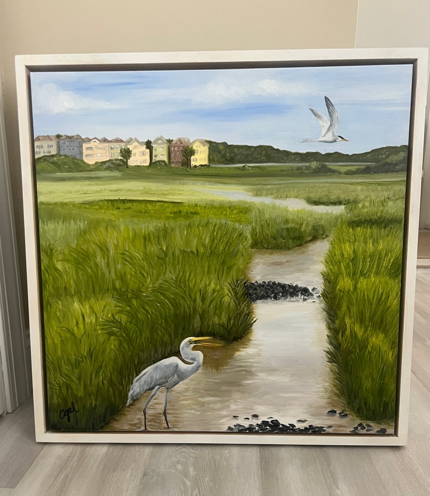 ”Marsh Life” 24in. X 24in. – oil painting/ White floater frame